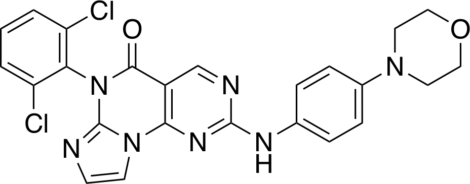 Chemical Name: 6-(2,6-dichlorophenyl)-2-((4-morpholinophenyl)amino)imidazo[1,2-a]pyrimido[5,4-e]pyrimidin-5(6H)-one