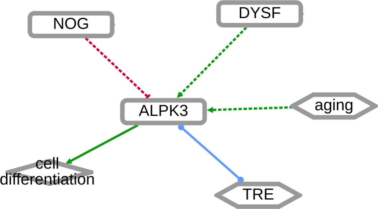 INDRA (Integrated Network and Dynamical Reasoning Assembler) is an automated model assembly system drawing from natural language processing systems and structured databases. It collects mechanistic and causal assertions, represents them in a standardized form (INDRA Statements), and assembles them into various modeling formalisms including causal graphs and dynamical models. More information on this work can be found on Github. In this particular figure, several interaction-types are depicted; physical complexes (blue), phosphorylation (black), and general up- or downregulation (green and red, respectively). Biomacromolecules are represented as squares, small molecule as circles, and biological processes and diamonds. The thickness of each line reflects a confidence score, with thicker lines higher in confidence.