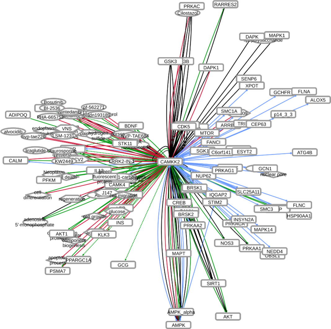 INDRA (Integrated Network and Dynamical Reasoning Assembler) is an automated model assembly system drawing from natural language processing systems and structured databases. It collects mechanistic and causal assertions, represents them in a standardized form (INDRA Statements), and assembles them into various modeling formalisms including causal graphs and dynamical models. More information on this work can be found on Github. In this particular figure, several interaction-types are depicted; physical complexes (blue), phosphorylation (black), and general up- or downregulation (green and red, respectively). Biomacromolecules are represented as squares, small molecule as circles, and biological processes and diamonds. The thickness of each line reflects a confidence score, with thicker lines higher in confidence.