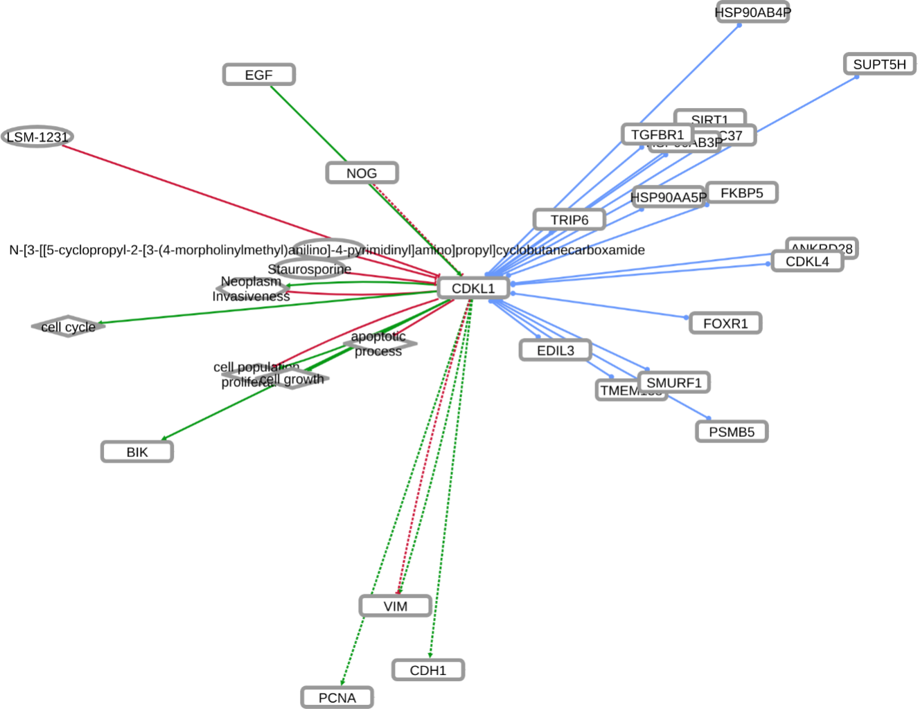 INDRA (Integrated Network and Dynamical Reasoning Assembler) is an automated model assembly system drawing from natural language processing systems and structured databases. It collects mechanistic and causal assertions, represents them in a standardized form (INDRA Statements), and assembles them into various modeling formalisms including causal graphs and dynamical models. More information on this work can be found on Github. In this particular figure, several interaction-types are depicted; physical complexes (blue), phosphorylation (black), and general up- or downregulation (green and red, respectively). Biomacromolecules are represented as squares, small molecule as circles, and biological processes and diamonds. The thickness of each line reflects a confidence score, with thicker lines higher in confidence.