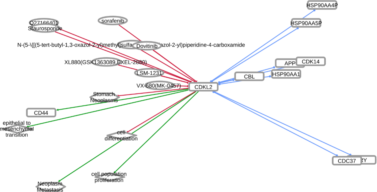 INDRA (Integrated Network and Dynamical Reasoning Assembler) is an automated model assembly system drawing from natural language processing systems and structured databases. It collects mechanistic and causal assertions, represents them in a standardized form (INDRA Statements), and assembles them into various modeling formalisms including causal graphs and dynamical models. More information on this work can be found on Github. In this particular figure, several interaction-types are depicted; physical complexes (blue), phosphorylation (black), and general up- or downregulation (green and red, respectively). Biomacromolecules are represented as squares, small molecule as circles, and biological processes and diamonds. The thickness of each line reflects a confidence score, with thicker lines higher in confidence.
