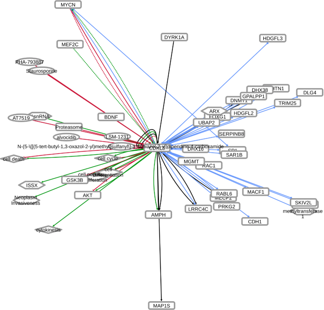 INDRA (Integrated Network and Dynamical Reasoning Assembler) is an automated model assembly system drawing from natural language processing systems and structured databases. It collects mechanistic and causal assertions, represents them in a standardized form (INDRA Statements), and assembles them into various modeling formalisms including causal graphs and dynamical models. More information on this work can be found on Github. In this particular figure, several interaction-types are depicted; physical complexes (blue), phosphorylation (black), and general up- or downregulation (green and red, respectively). Biomacromolecules are represented as squares, small molecule as circles, and biological processes and diamonds. The thickness of each line reflects a confidence score, with thicker lines higher in confidence.