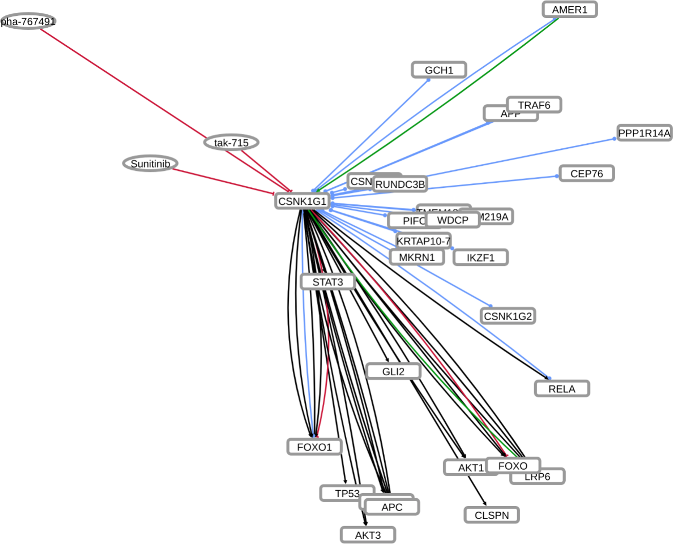 INDRA (Integrated Network and Dynamical Reasoning Assembler) is an automated model assembly system drawing from natural language processing systems and structured databases. It collects mechanistic and causal assertions, represents them in a standardized form (INDRA Statements), and assembles them into various modeling formalisms including causal graphs and dynamical models. More information on this work can be found on Github. In this particular figure, several interaction-types are depicted; physical complexes (blue), phosphorylation (black), and general up- or downregulation (green and red, respectively). Biomacromolecules are represented as squares, small molecule as circles, and biological processes and diamonds. The thickness of each line reflects a confidence score, with thicker lines higher in confidence.