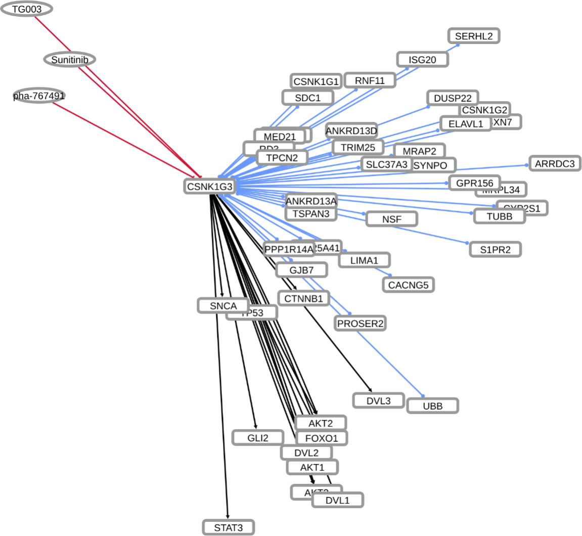 INDRA (Integrated Network and Dynamical Reasoning Assembler) is an automated model assembly system drawing from natural language processing systems and structured databases. It collects mechanistic and causal assertions, represents them in a standardized form (INDRA Statements), and assembles them into various modeling formalisms including causal graphs and dynamical models. More information on this work can be found on Github. In this particular figure, several interaction-types are depicted; physical complexes (blue), phosphorylation (black), and general up- or downregulation (green and red, respectively). Biomacromolecules are represented as squares, small molecule as circles, and biological processes and diamonds. The thickness of each line reflects a confidence score, with thicker lines higher in confidence.
