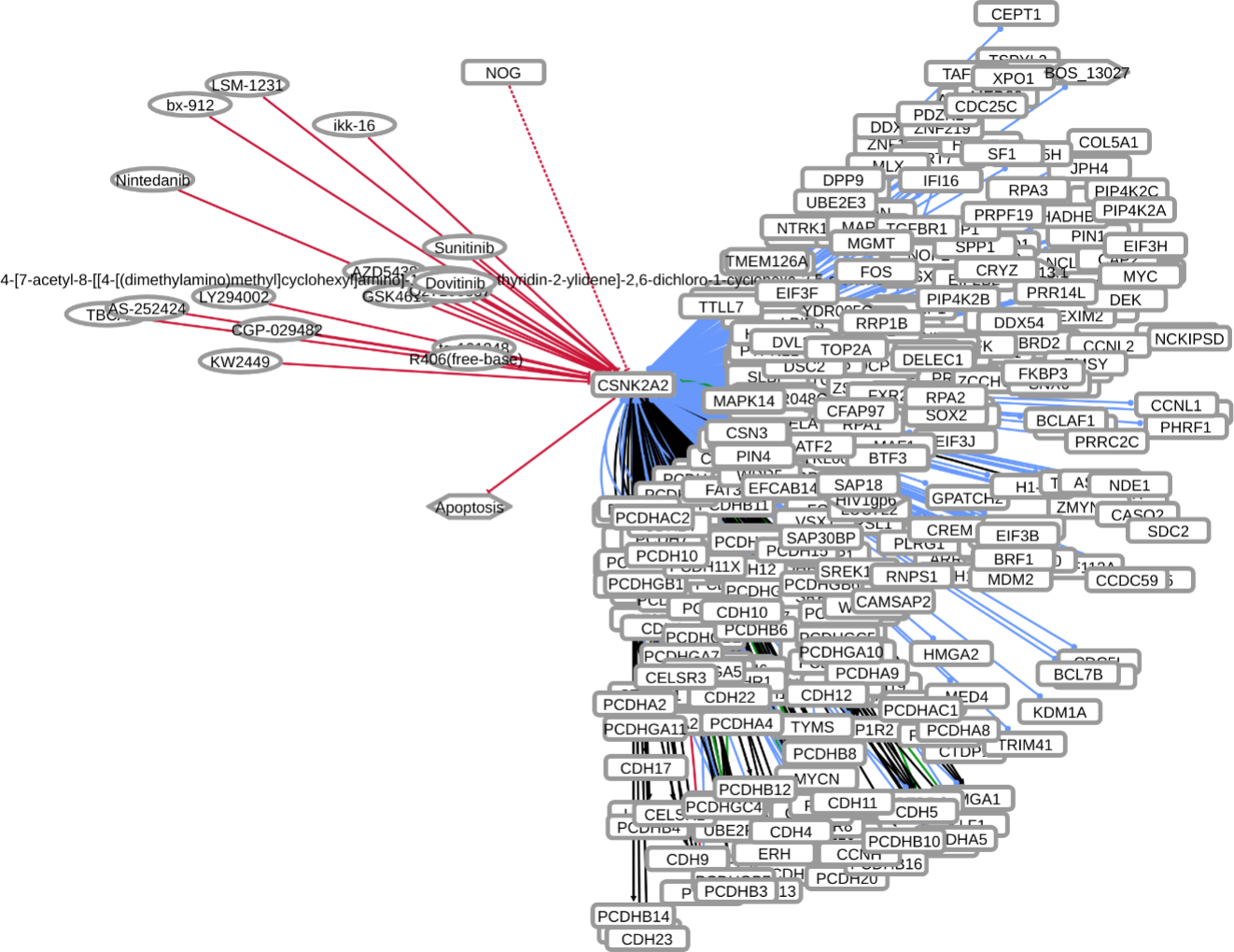INDRA (Integrated Network and Dynamical Reasoning Assembler) is an automated model assembly system drawing from natural language processing systems and structured databases. It collects mechanistic and causal assertions, represents them in a standardized form (INDRA Statements), and assembles them into various modeling formalisms including causal graphs and dynamical models. More information on this work can be found on Github. In this particular figure, several interaction-types are depicted; physical complexes (blue), phosphorylation (black), and general up- or downregulation (green and red, respectively). Biomacromolecules are represented as squares, small molecule as circles, and biological processes and diamonds. The thickness of each line reflects a confidence score, with thicker lines higher in confidence.