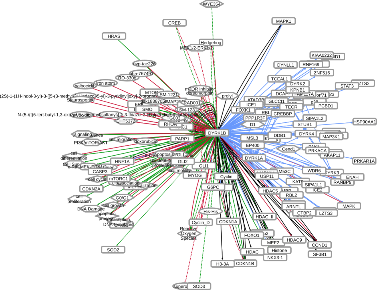 INDRA (Integrated Network and Dynamical Reasoning Assembler) is an automated model assembly system drawing from natural language processing systems and structured databases. It collects mechanistic and causal assertions, represents them in a standardized form (INDRA Statements), and assembles them into various modeling formalisms including causal graphs and dynamical models. More information on this work can be found on Github. In this particular figure, several interaction-types are depicted; physical complexes (blue), phosphorylation (black), and general up- or downregulation (green and red, respectively). Biomacromolecules are represented as squares, small molecule as circles, and biological processes and diamonds. The thickness of each line reflects a confidence score, with thicker lines higher in confidence.