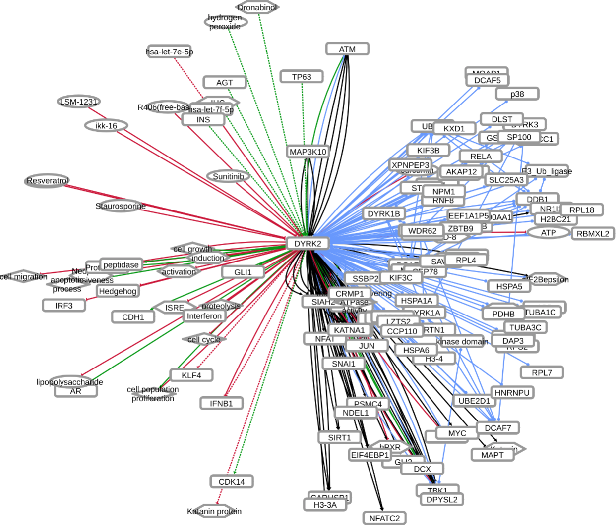 INDRA (Integrated Network and Dynamical Reasoning Assembler) is an automated model assembly system drawing from natural language processing systems and structured databases. It collects mechanistic and causal assertions, represents them in a standardized form (INDRA Statements), and assembles them into various modeling formalisms including causal graphs and dynamical models. More information on this work can be found on Github. In this particular figure, several interaction-types are depicted; physical complexes (blue), phosphorylation (black), and general up- or downregulation (green and red, respectively). Biomacromolecules are represented as squares, small molecule as circles, and biological processes and diamonds. The thickness of each line reflects a confidence score, with thicker lines higher in confidence.