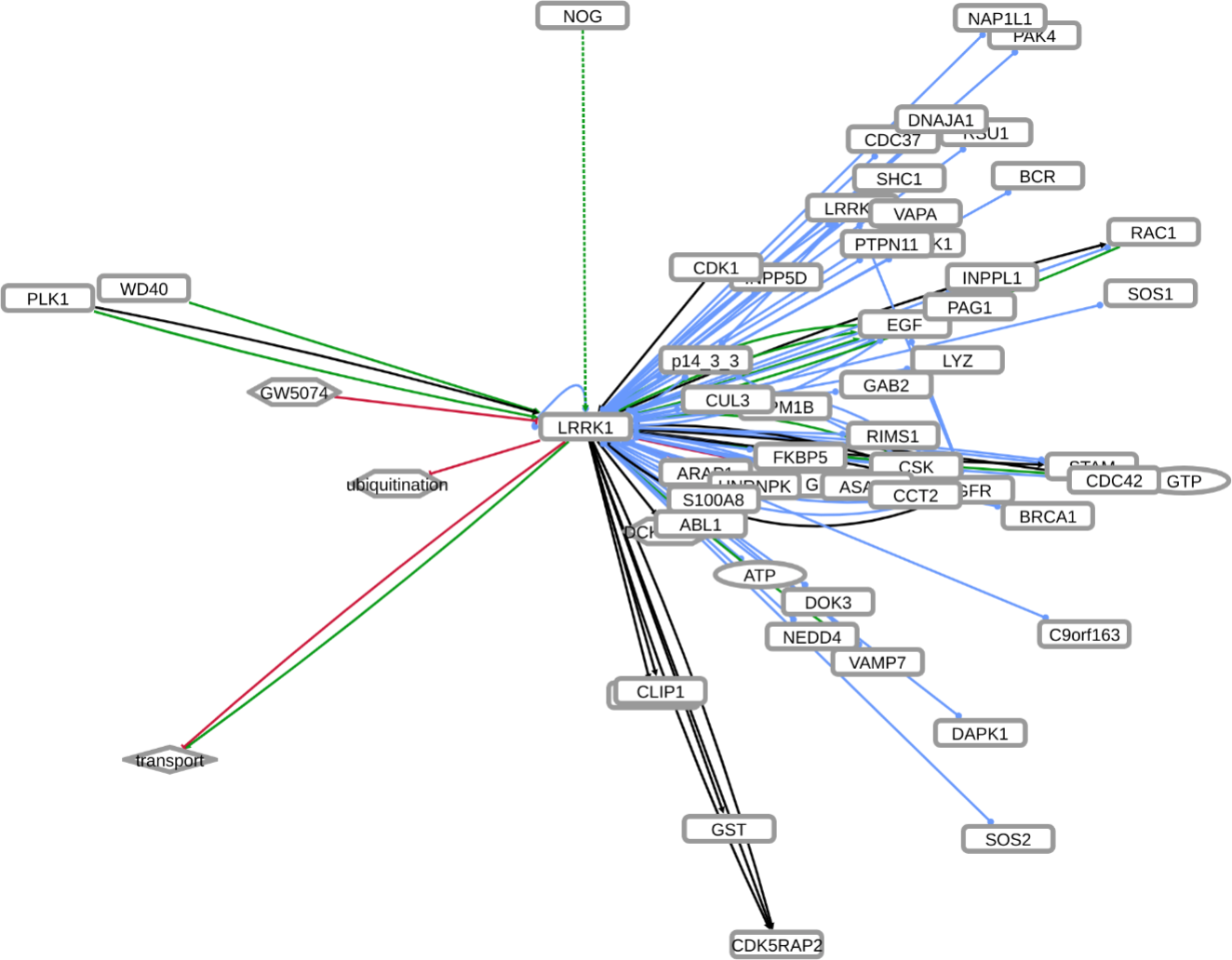 INDRA (Integrated Network and Dynamical Reasoning Assembler) is an automated model assembly system drawing from natural language processing systems and structured databases. It collects mechanistic and causal assertions, represents them in a standardized form (INDRA Statements), and assembles them into various modeling formalisms including causal graphs and dynamical models. More information on this work can be found on Github. In this particular figure, several interaction-types are depicted; physical complexes (blue), phosphorylation (black), and general up- or downregulation (green and red, respectively). Biomacromolecules are represented as squares, small molecule as circles, and biological processes and diamonds. The thickness of each line reflects a confidence score, with thicker lines higher in confidence.