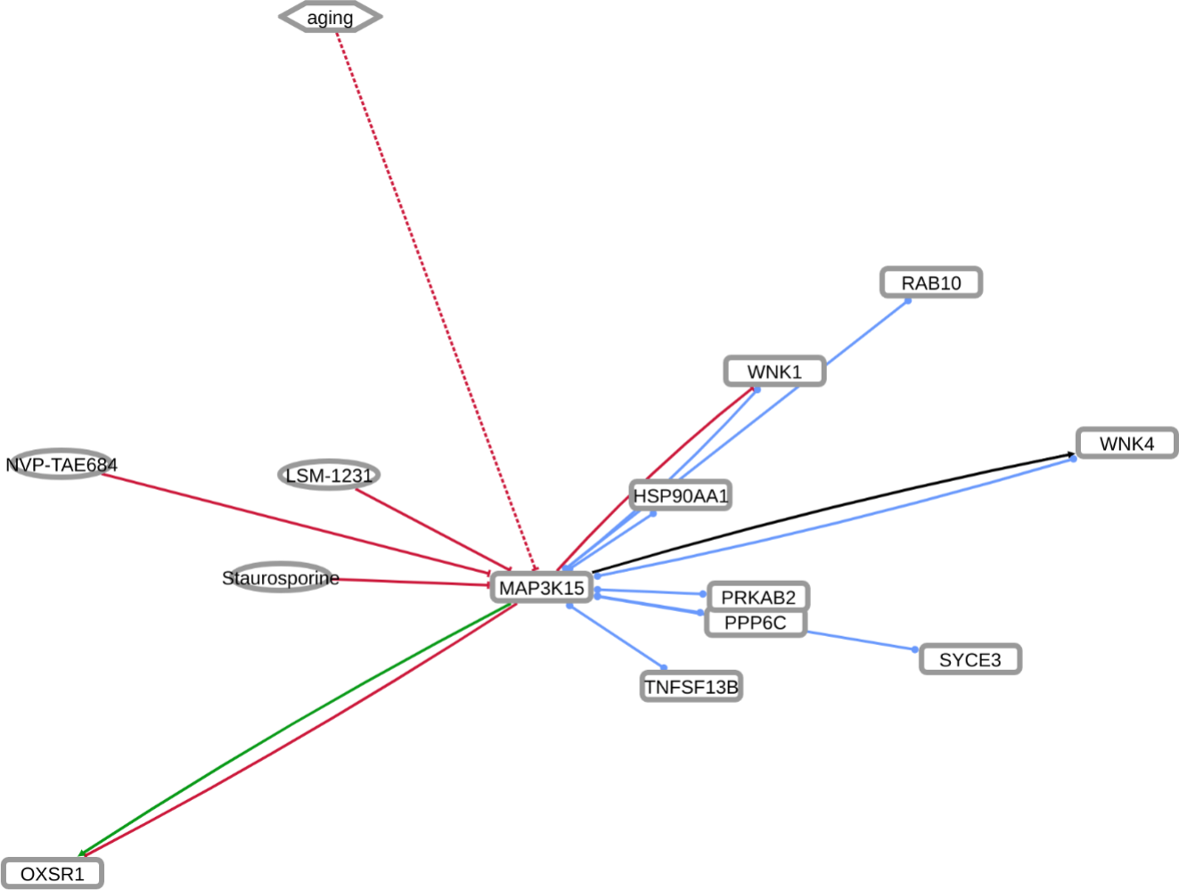 INDRA (Integrated Network and Dynamical Reasoning Assembler) is an automated model assembly system drawing from natural language processing systems and structured databases. It collects mechanistic and causal assertions, represents them in a standardized form (INDRA Statements), and assembles them into various modeling formalisms including causal graphs and dynamical models. More information on this work can be found on Github. In this particular figure, several interaction-types are depicted; physical complexes (blue), phosphorylation (black), and general up- or downregulation (green and red, respectively). Biomacromolecules are represented as squares, small molecule as circles, and biological processes and diamonds. The thickness of each line reflects a confidence score, with thicker lines higher in confidence.