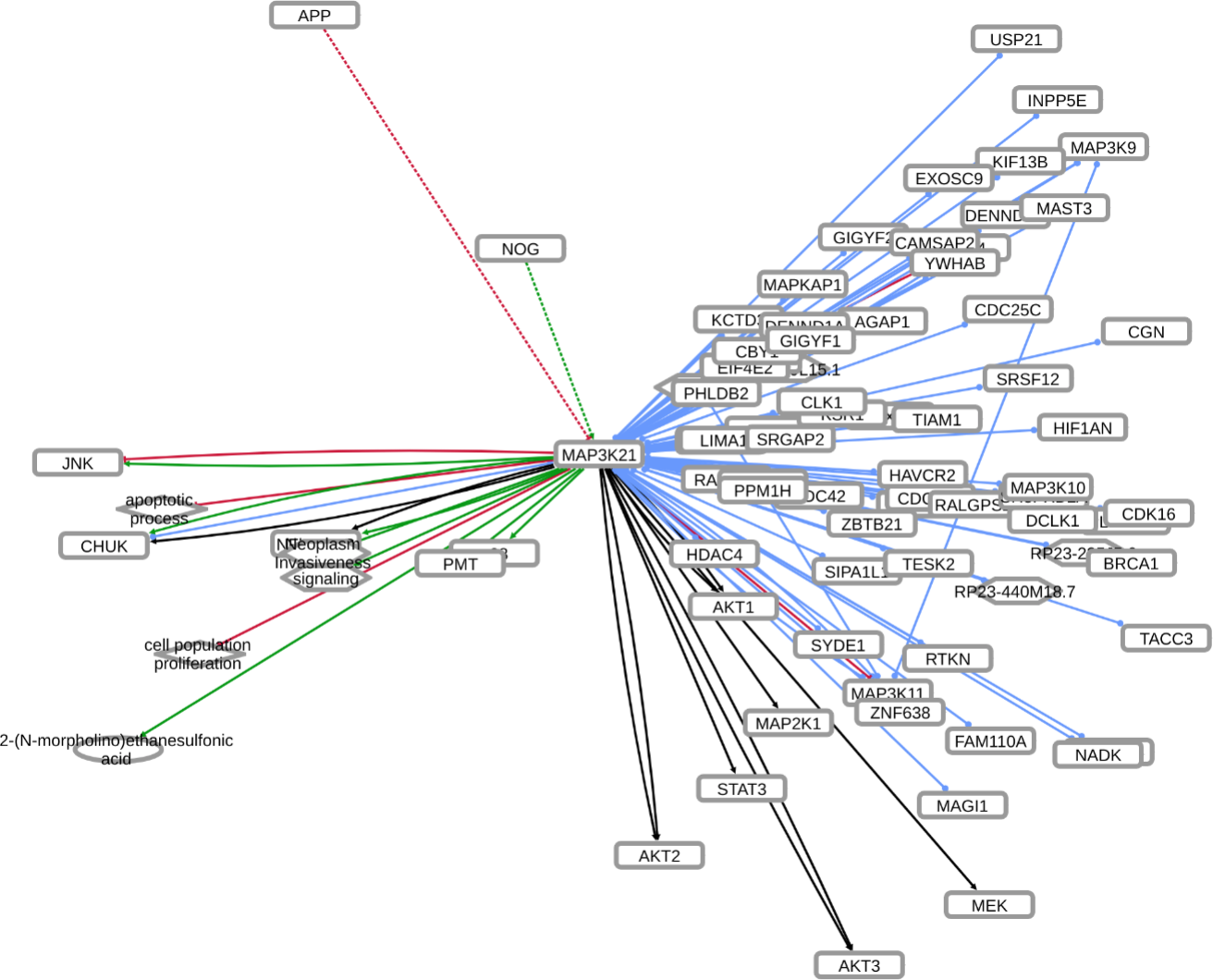 The Reactome Knowledgebase of Human Biological Pathways and Processes is a curated and peer-reviewed knowledgebase available online as an open access resource that can be freely used and distributed by all members of the biological research community. This view of the reactome database is focused on MAP3K21 and displays the pathways associated with MAP3K21.