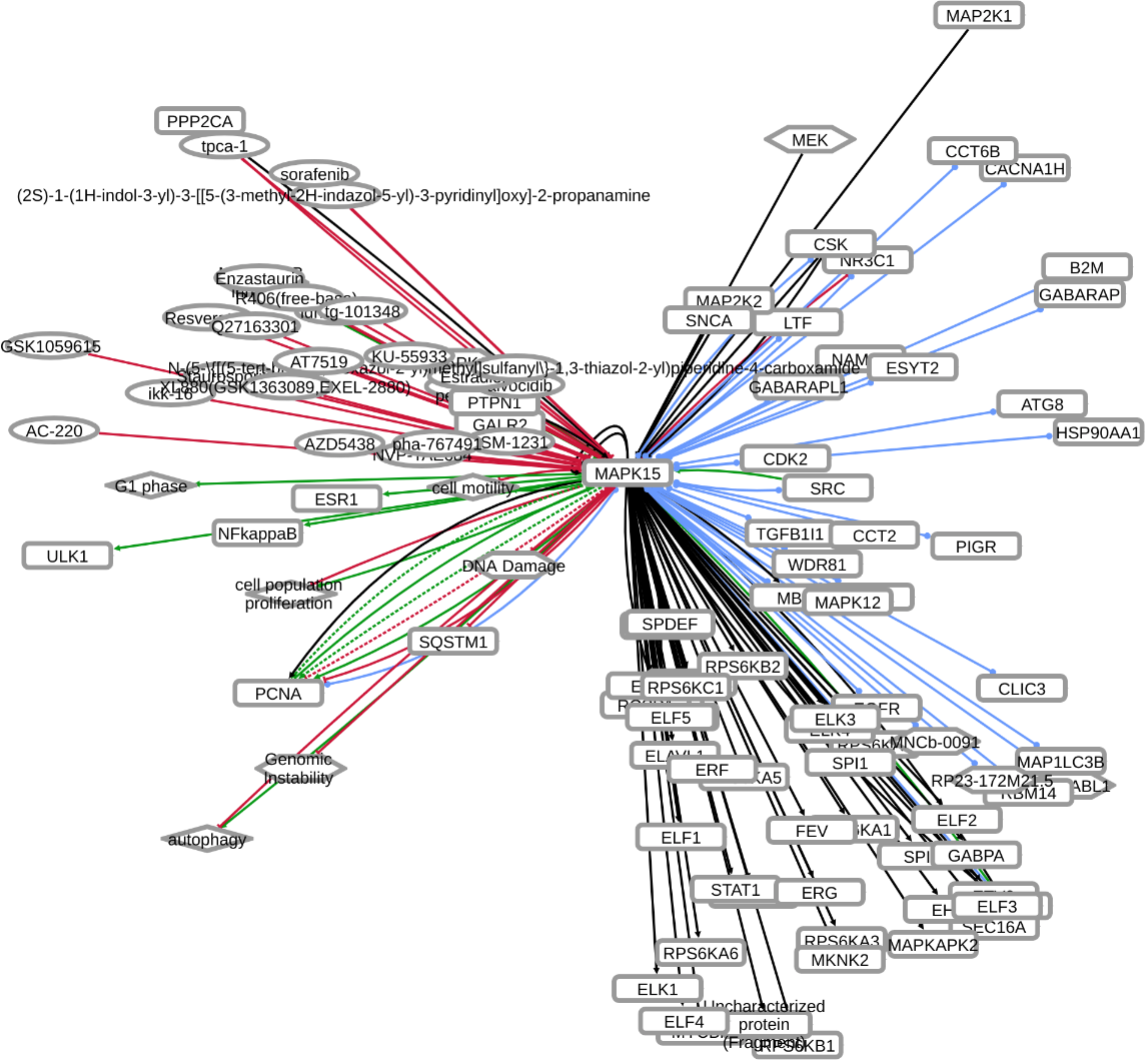 INDRA (Integrated Network and Dynamical Reasoning Assembler) is an automated model assembly system drawing from natural language processing systems and structured databases. It collects mechanistic and causal assertions, represents them in a standardized form (INDRA Statements), and assembles them into various modeling formalisms including causal graphs and dynamical models. More information on this work can be found on Github. In this particular figure, several interaction-types are depicted; physical complexes (blue), phosphorylation (black), and general up- or downregulation (green and red, respectively). Biomacromolecules are represented as squares, small molecule as circles, and biological processes and diamonds. The thickness of each line reflects a confidence score, with thicker lines higher in confidence.