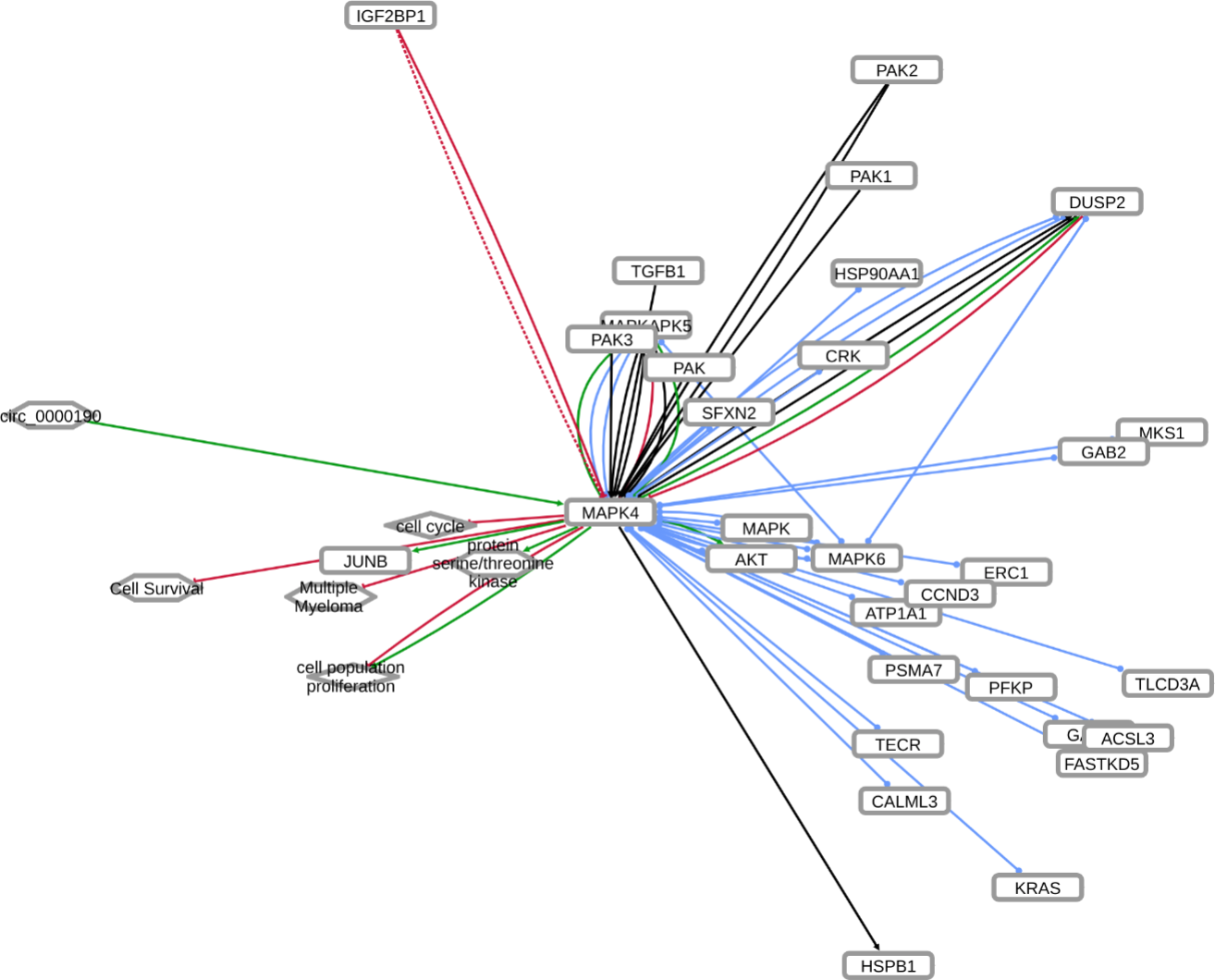INDRA (Integrated Network and Dynamical Reasoning Assembler) is an automated model assembly system drawing from natural language processing systems and structured databases. It collects mechanistic and causal assertions, represents them in a standardized form (INDRA Statements), and assembles them into various modeling formalisms including causal graphs and dynamical models. More information on this work can be found on Github. In this particular figure, several interaction-types are depicted; physical complexes (blue), phosphorylation (black), and general up- or downregulation (green and red, respectively). Biomacromolecules are represented as squares, small molecule as circles, and biological processes and diamonds. The thickness of each line reflects a confidence score, with thicker lines higher in confidence.