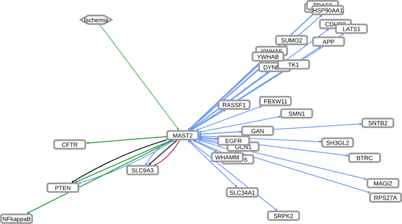 INDRA (Integrated Network and Dynamical Reasoning Assembler) is an automated model assembly system drawing from natural language processing systems and structured databases. It collects mechanistic and causal assertions, represents them in a standardized form (INDRA Statements), and assembles them into various modeling formalisms including causal graphs and dynamical models. More information on this work can be found on Github. In this particular figure, several interaction-types are depicted; physical complexes (blue), phosphorylation (black), and general up- or downregulation (green and red, respectively). Biomacromolecules are represented as squares, small molecule as circles, and biological processes and diamonds. The thickness of each line reflects a confidence score, with thicker lines higher in confidence.