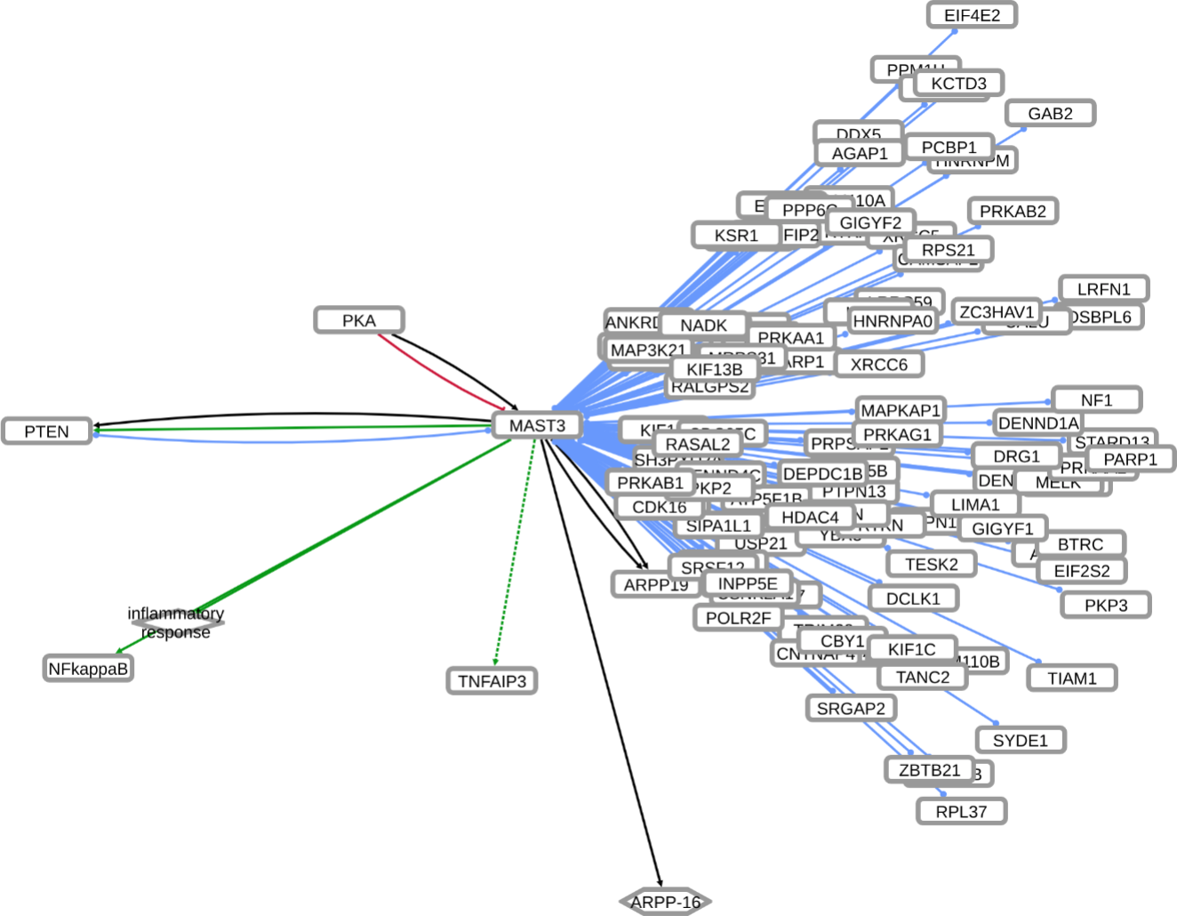 INDRA (Integrated Network and Dynamical Reasoning Assembler) is an automated model assembly system drawing from natural language processing systems and structured databases. It collects mechanistic and causal assertions, represents them in a standardized form (INDRA Statements), and assembles them into various modeling formalisms including causal graphs and dynamical models. More information on this work can be found on Github. In this particular figure, several interaction-types are depicted; physical complexes (blue), phosphorylation (black), and general up- or downregulation (green and red, respectively). Biomacromolecules are represented as squares, small molecule as circles, and biological processes and diamonds. The thickness of each line reflects a confidence score, with thicker lines higher in confidence.