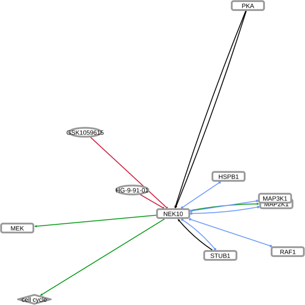 The Reactome Knowledgebase of Human Biological Pathways and Processes is a curated and peer-reviewed knowledgebase available online as an open access resource that can be freely used and distributed by all members of the biological research community. This view of the reactome database is focused on NEK10 and displays the pathways associated with NEK10.