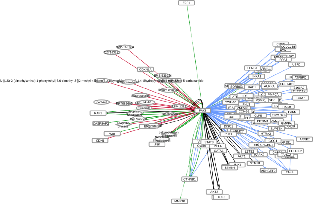INDRA (Integrated Network and Dynamical Reasoning Assembler) is an automated model assembly system drawing from natural language processing systems and structured databases. It collects mechanistic and causal assertions, represents them in a standardized form (INDRA Statements), and assembles them into various modeling formalisms including causal graphs and dynamical models. More information on this work can be found on Github. In this particular figure, several interaction-types are depicted; physical complexes (blue), phosphorylation (black), and general up- or downregulation (green and red, respectively). Biomacromolecules are represented as squares, small molecule as circles, and biological processes and diamonds. The thickness of each line reflects a confidence score, with thicker lines higher in confidence.