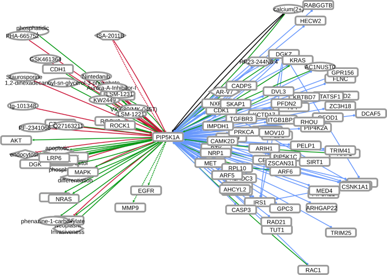 INDRA (Integrated Network and Dynamical Reasoning Assembler) is an automated model assembly system drawing from natural language processing systems and structured databases. It collects mechanistic and causal assertions, represents them in a standardized form (INDRA Statements), and assembles them into various modeling formalisms including causal graphs and dynamical models. More information on this work can be found on Github. In this particular figure, several interaction-types are depicted; physical complexes (blue), phosphorylation (black), and general up- or downregulation (green and red, respectively). Biomacromolecules are represented as squares, small molecule as circles, and biological processes and diamonds. The thickness of each line reflects a confidence score, with thicker lines higher in confidence.