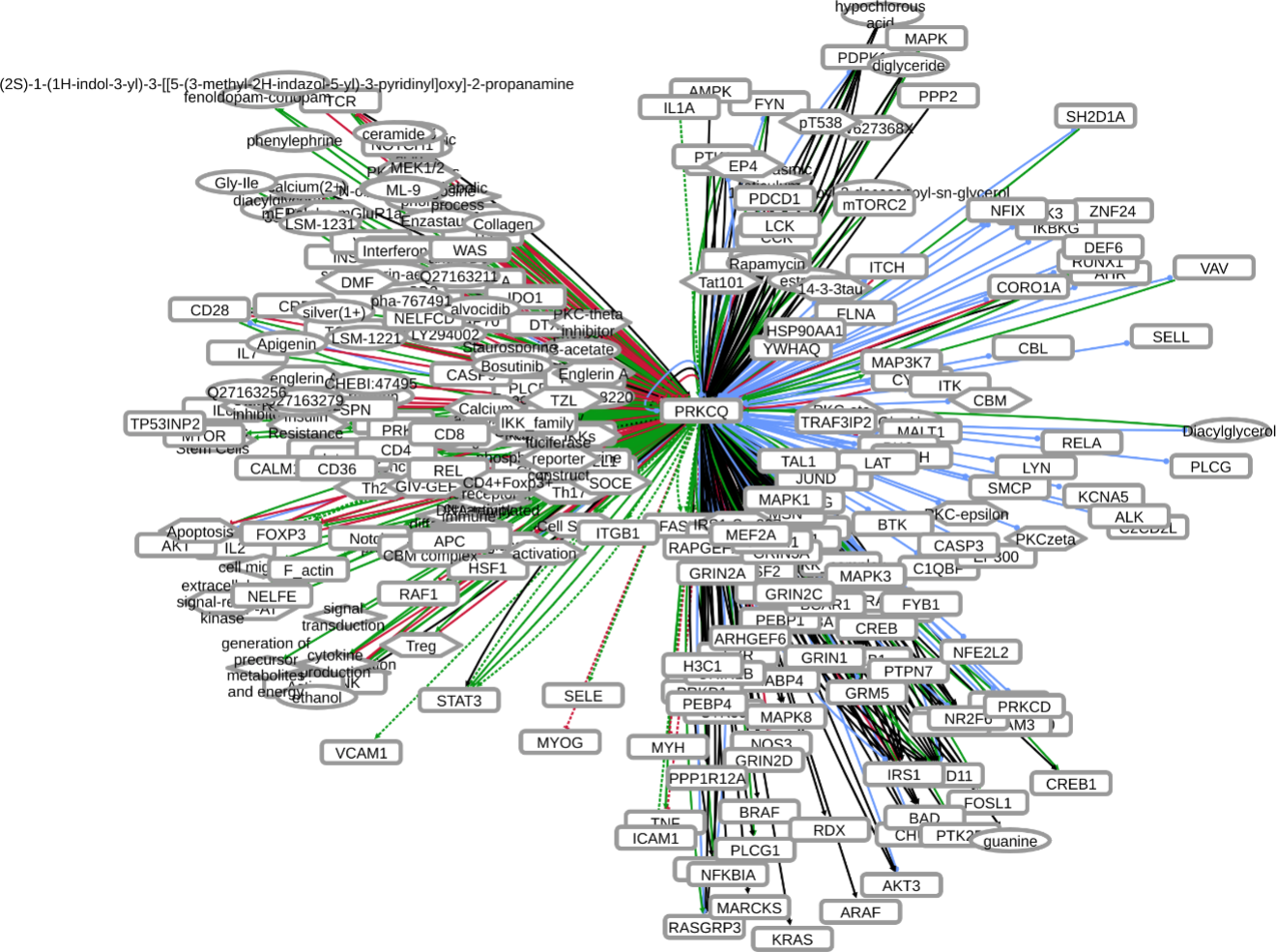 INDRA (Integrated Network and Dynamical Reasoning Assembler) is an automated model assembly system drawing from natural language processing systems and structured databases. It collects mechanistic and causal assertions, represents them in a standardized form (INDRA Statements), and assembles them into various modeling formalisms including causal graphs and dynamical models. More information on this work can be found on Github. In this particular figure, several interaction-types are depicted; physical complexes (blue), phosphorylation (black), and general up- or downregulation (green and red, respectively). Biomacromolecules are represented as squares, small molecule as circles, and biological processes and diamonds. The thickness of each line reflects a confidence score, with thicker lines higher in confidence.