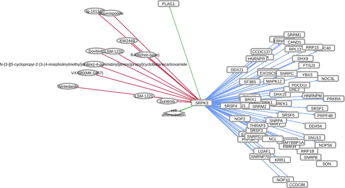 INDRA (Integrated Network and Dynamical Reasoning Assembler) is an automated model assembly system drawing from natural language processing systems and structured databases. It collects mechanistic and causal assertions, represents them in a standardized form (INDRA Statements), and assembles them into various modeling formalisms including causal graphs and dynamical models. More information on this work can be found on Github. In this particular figure, several interaction-types are depicted; physical complexes (blue), phosphorylation (black), and general up- or downregulation (green and red, respectively). Biomacromolecules are represented as squares, small molecule as circles, and biological processes and diamonds. The thickness of each line reflects a confidence score, with thicker lines higher in confidence.