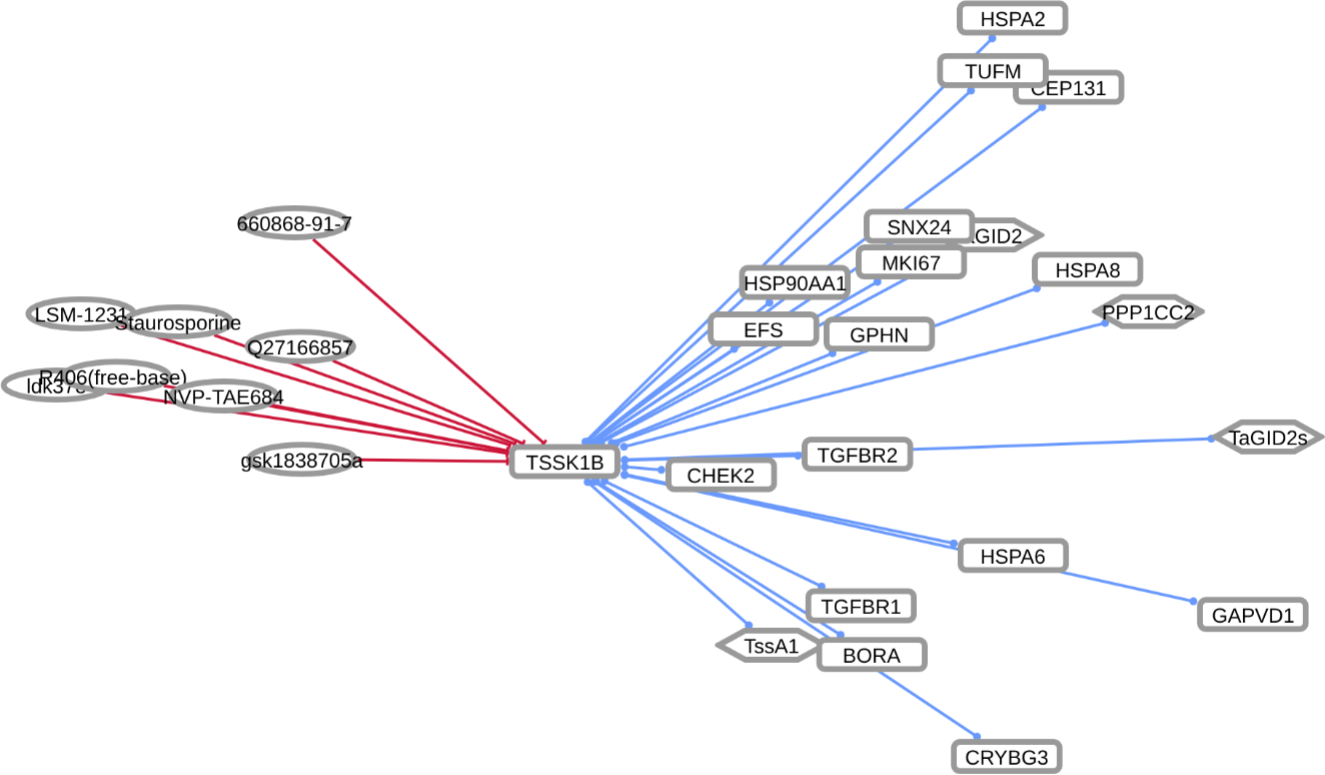 INDRA (Integrated Network and Dynamical Reasoning Assembler) is an automated model assembly system drawing from natural language processing systems and structured databases. It collects mechanistic and causal assertions, represents them in a standardized form (INDRA Statements), and assembles them into various modeling formalisms including causal graphs and dynamical models. More information on this work can be found on Github. In this particular figure, several interaction-types are depicted; physical complexes (blue), phosphorylation (black), and general up- or downregulation (green and red, respectively). Biomacromolecules are represented as squares, small molecule as circles, and biological processes and diamonds. The thickness of each line reflects a confidence score, with thicker lines higher in confidence.