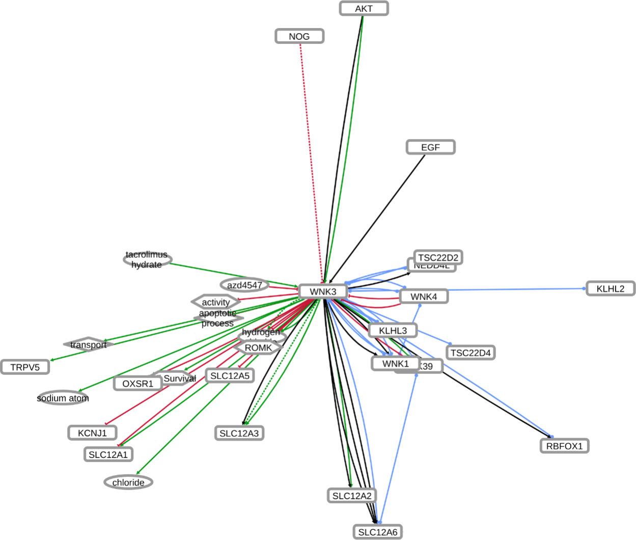 INDRA (Integrated Network and Dynamical Reasoning Assembler) is an automated model assembly system drawing from natural language processing systems and structured databases. It collects mechanistic and causal assertions, represents them in a standardized form (INDRA Statements), and assembles them into various modeling formalisms including causal graphs and dynamical models. More information on this work can be found on Github. In this particular figure, several interaction-types are depicted; physical complexes (blue), phosphorylation (black), and general up- or downregulation (green and red, respectively). Biomacromolecules are represented as squares, small molecule as circles, and biological processes and diamonds. The thickness of each line reflects a confidence score, with thicker lines higher in confidence.